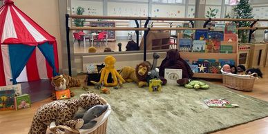 We organise the the learning environment into zones of experience for instance, the reading corner; with puppets, a tent, a comfortable rug, pillows and a range of soft toys/ puppets for the children to (re)create and enjoy story telling with their play partners.